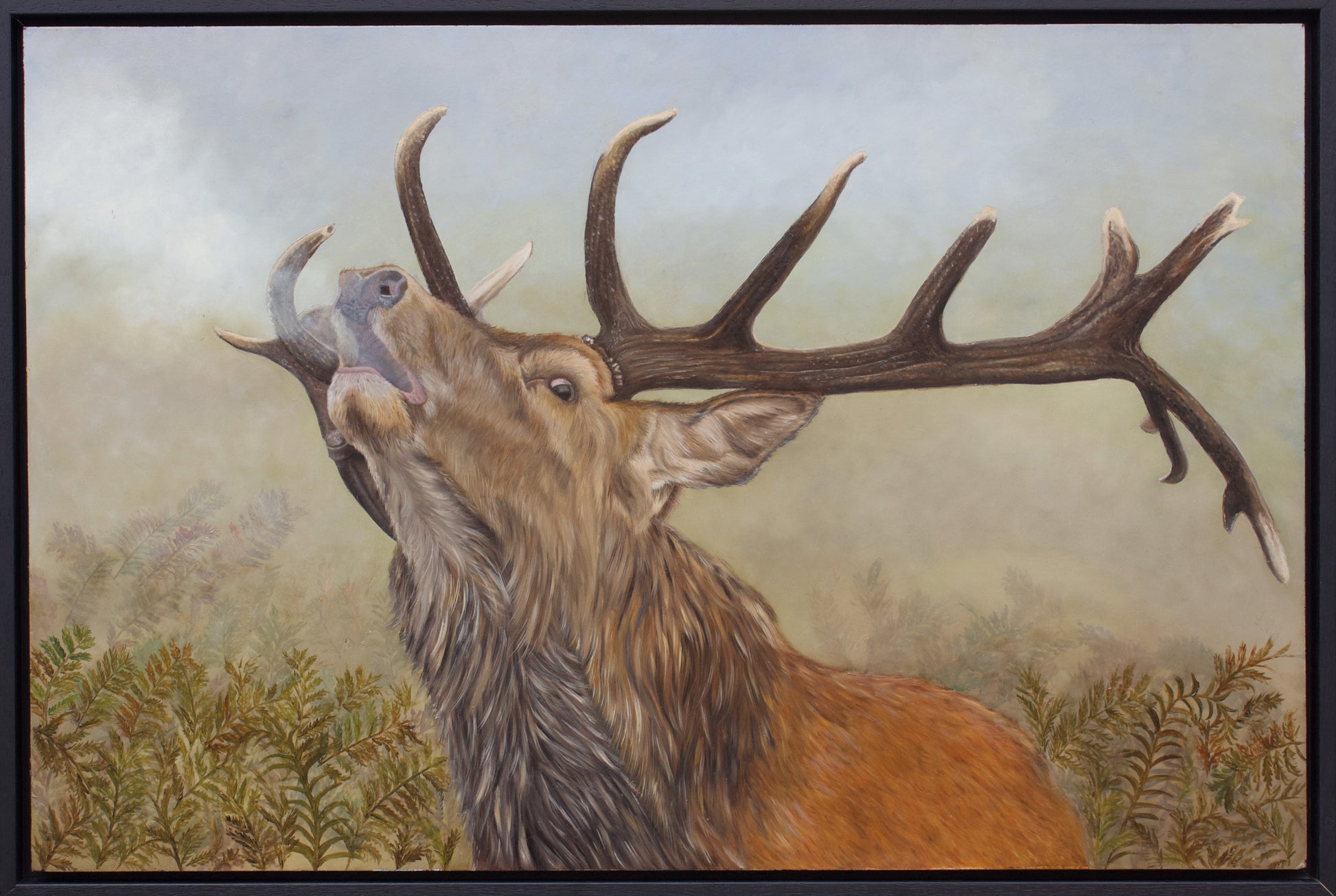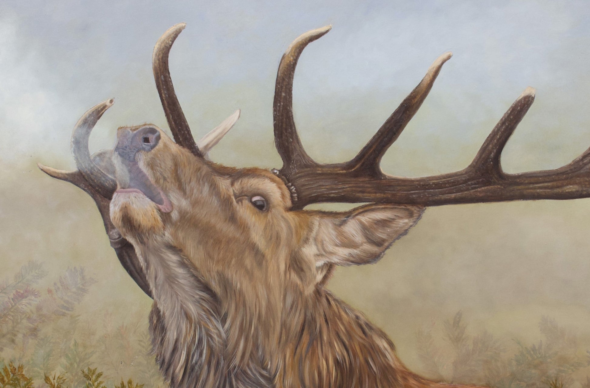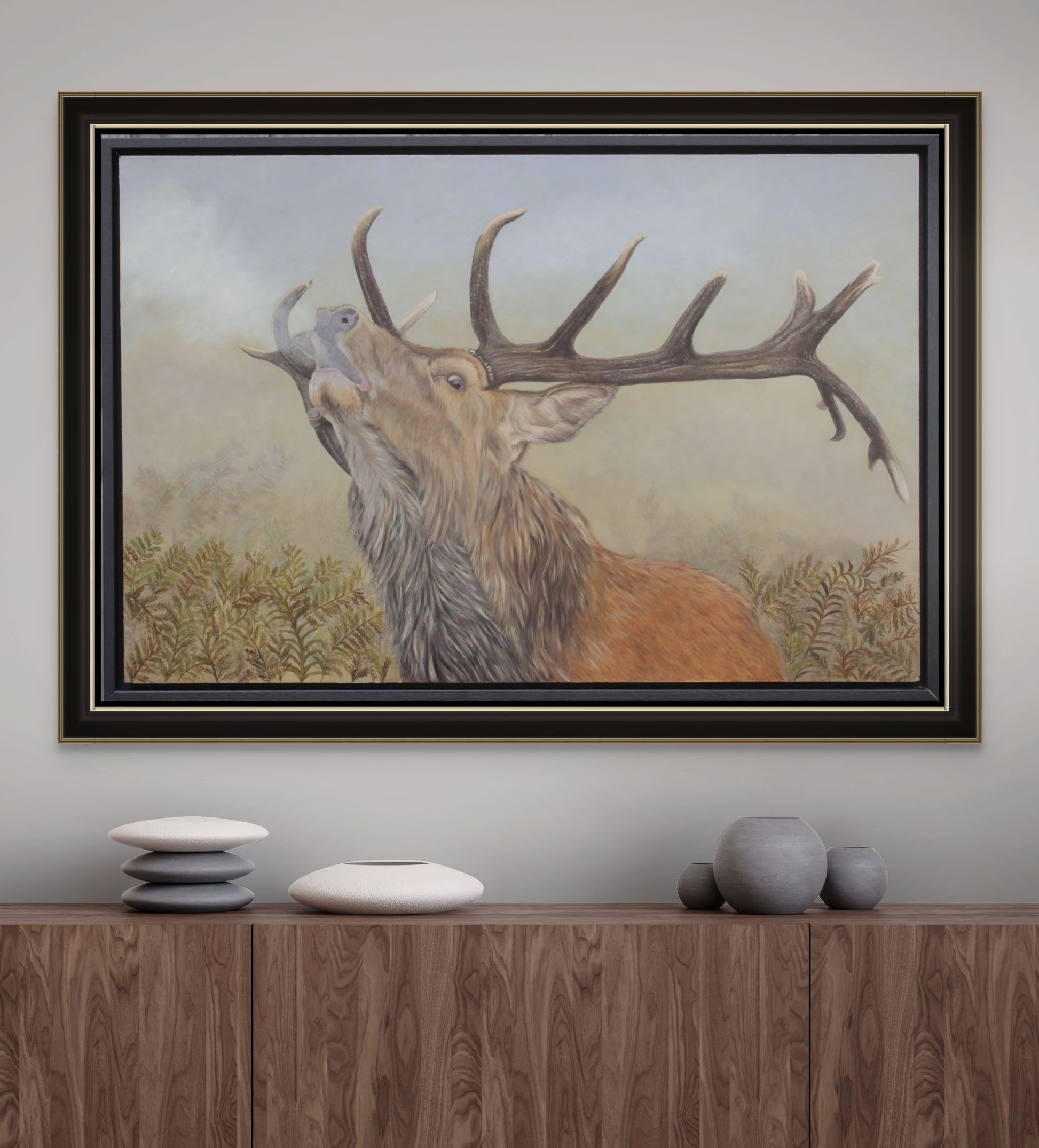 In de stilte van de vroege ochtend weerklinkt de krachtige roep van het edelhert door de nevelige velden. De adem vormt wolkjes in de koude lucht, terwijl het dier met geheven kop zijn aanwezigheid kenbaar maakt — een tijdloos ritueel van kracht, verlangen en instinct.