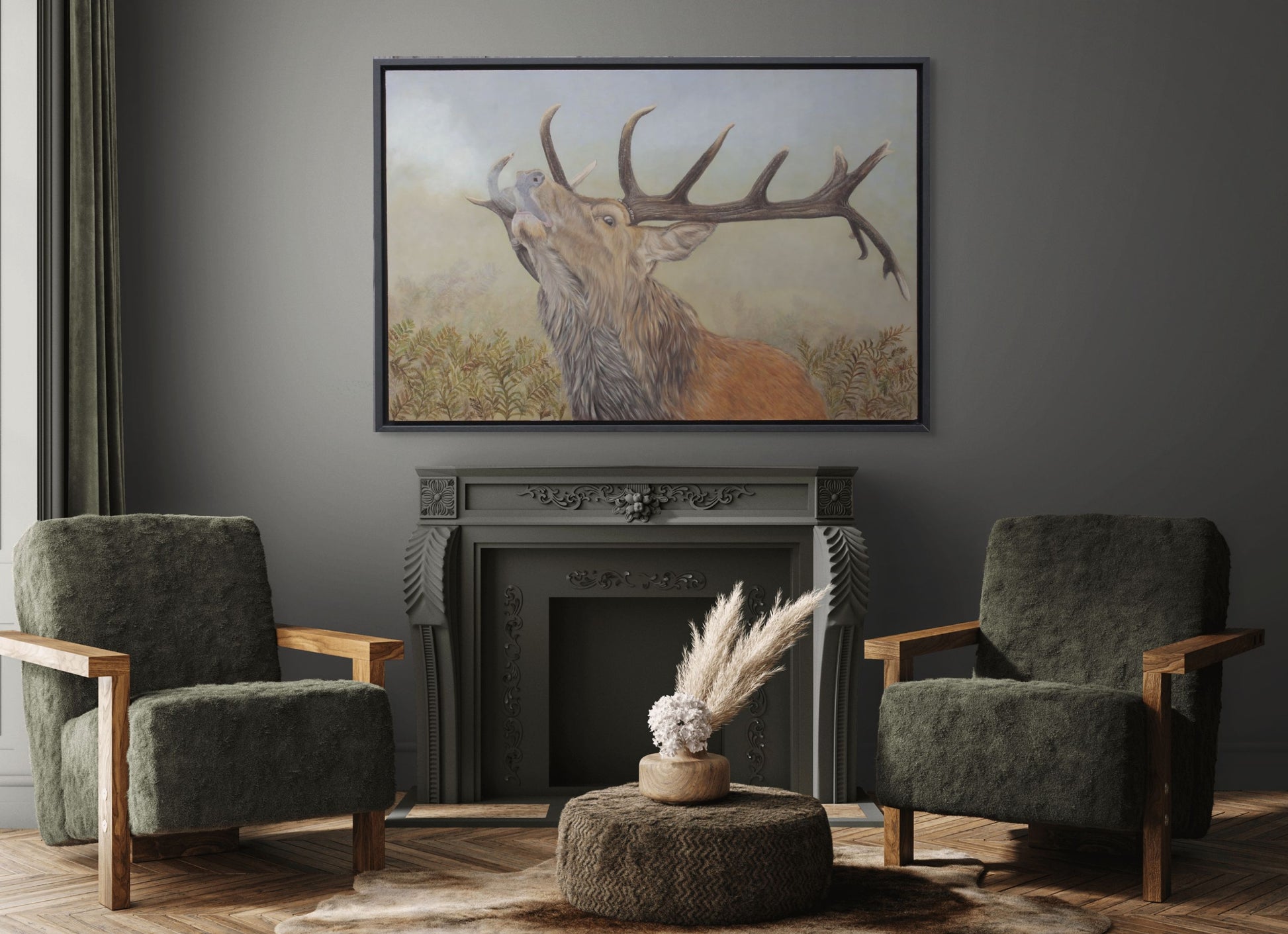 Stem van de Dageraad vangt het magische moment waarop de natuur nog half slaapt, maar het leven zich al laat horen. De zachte kleuren van de mist contrasteren subtiel met de warme tinten van de vacht, en maken dit werk tot een ode aan de kwetsbare koning van het woud.