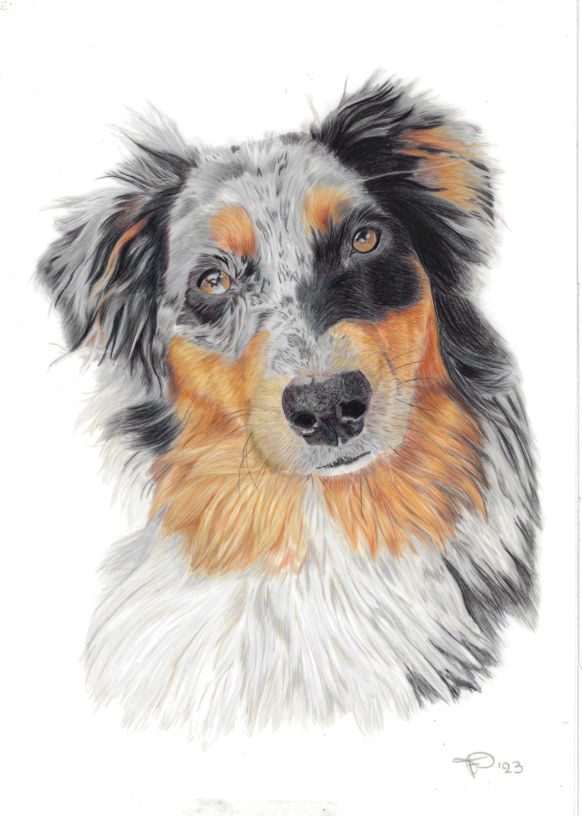 Met haar alerte blik en speelse nieuwsgierigheid straalt Maddy alles uit wat de Australische herder zo bijzonder maakt. Dit portret vangt niet alleen haar levendige expressie, maar ook haar onbegrensde energie en intelligentie—altijd klaar om nieuwe avonturen te beleven of een nieuwe truc te leren.